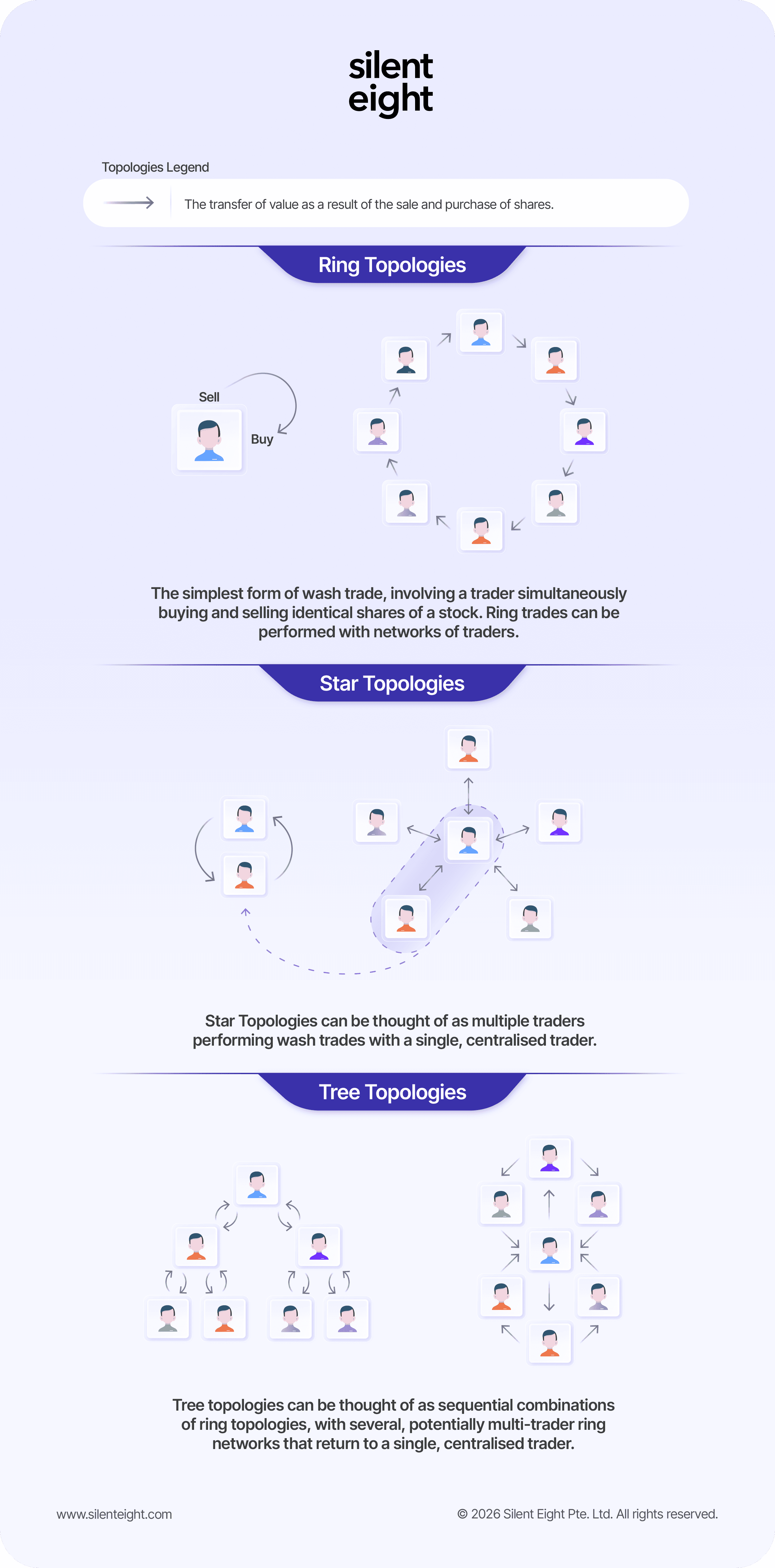 For surveillance teams, the key task is identifying the transaction patterns that suggest these collusive trading practices. In the simplest terms, these illicit networks can take various shapes, including ring, star, or tree topologies designed to distribute activity.